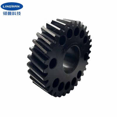 El engranaje es una parte común en la transmisión mecánica, engranaje se hace del tratamiento de alta resistencia de alta calidad del acero de aleación, carburada y endurecido de superficie, fuerza de sustentación fuerte, durable. El engranaje usado por la tirada del laser se puede dividir en el engranaje recto y el engranaje helicoidal. El coeficiente de la coincidencia de engranajes helicoidales es mayor que los engranajes de estímulo, así que la fuerza de sustentación de engranajes helicoidales es más alta que los engranajes de estímulo. En el uso práctico, el engranaje helicoidal es ampliamente utilizado en ocasiones de alta velocidad y resistentes debido a sus características de la transmisión lisa, del impacto bajo, de la vibración y del ruido. La ventaja más grande de engranajes helicoidales es alta exactitud de la transmisión, seguida por de intensidad alta y ruido y el control de la vibración (coincidencia de gama alta, resonancia armónica baja en análisis modal). Los engranajes rectos pueden incluso hacer los engranajes mejor que helicoidales puramente desde el punto de vista de la suavidad del movimiento (suavidad de la línea curvas de carga).